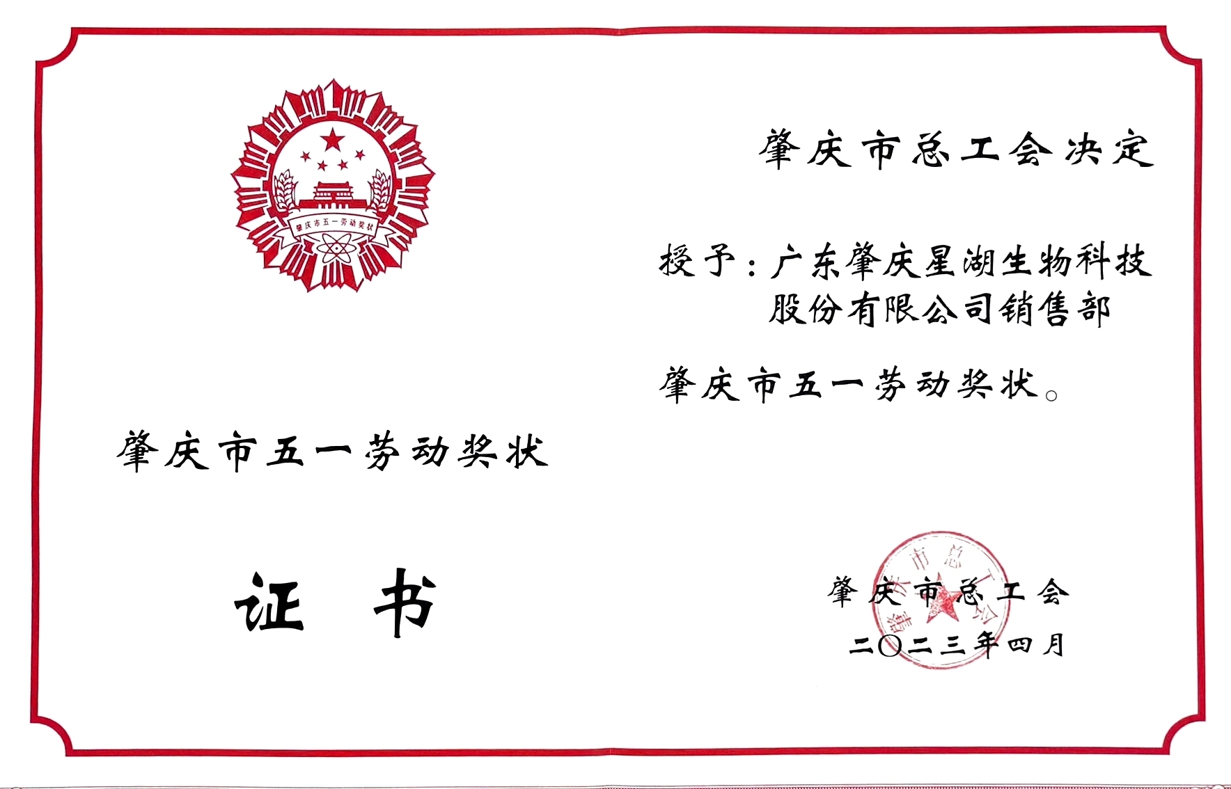 4月27日,2023年肇慶市慶?!拔逡弧眹H勞動節(jié)大會在市委小禮堂舉行,大會表彰了2023年全國和省、市“五一”勞動獎集體和個人。星湖科技銷售部榮獲“肇慶市五一勞動獎狀”。